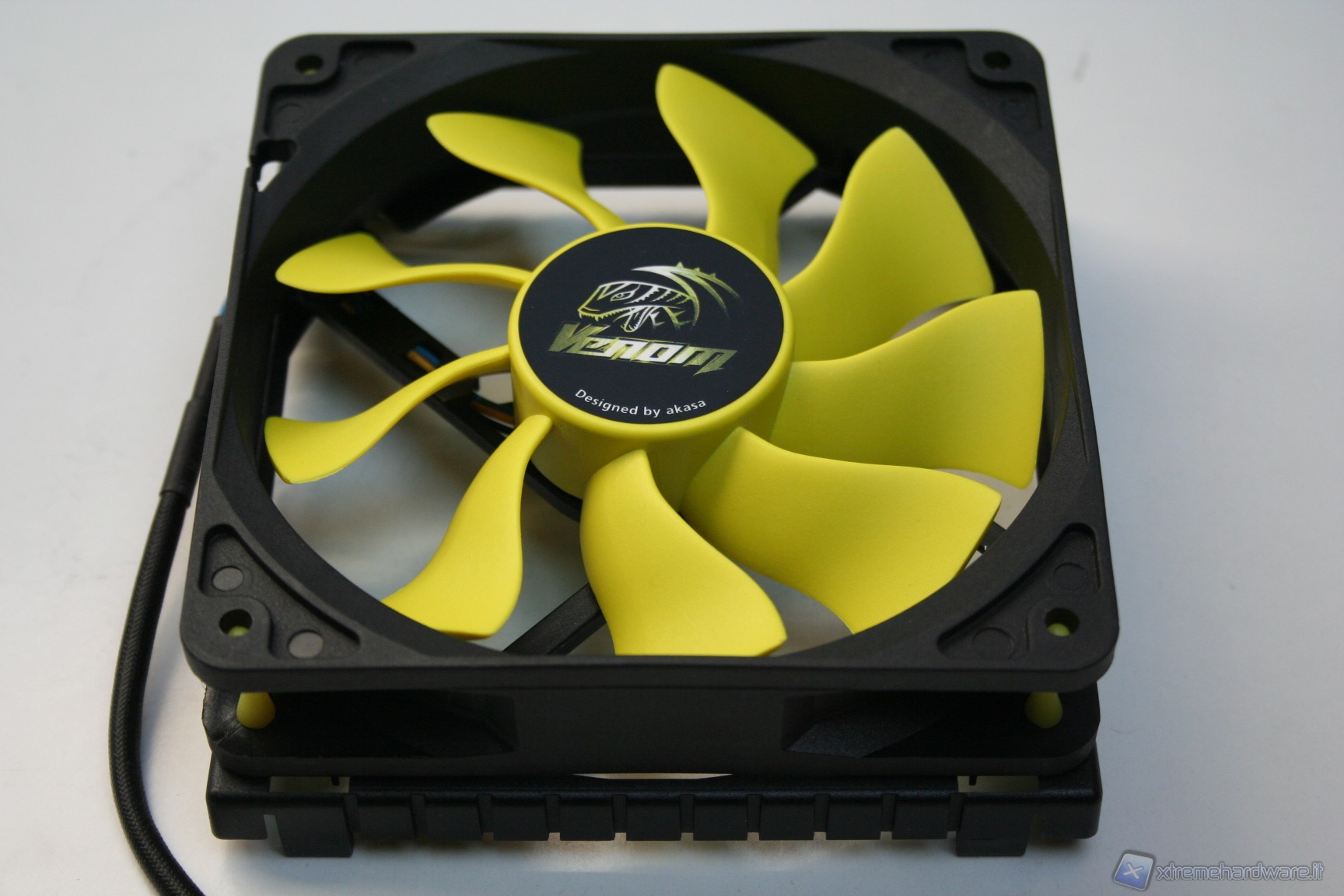 Nella parte superiore c’è una copertura di plastica dura con il logo Akasa sovrapposta ad una copertura a griglia metallica con colorazione gialla, tutto ciò conferisce un aspetto molto aggressivo e davvero di impatto. Il radiatore presenta delle lamelle sufficientemente spaziate (spesse 0.5mm e spaziate 2mm), di modo che il flusso d’aria non venga eccessivamente ostruito. Con questa struttura ci sono pochissime zone morte dove l’aria non riesce a passare, precisamente dietro ognuna delle heatpipe; in linea teorica potrebbe venire a formarsi un piccolo triangolo non areato, ma comunque è un discorso valido per una buona parte dei dissipatori attualmente in commercio quindi nulla di preoccupante. Le heatpipes sono in rame e le alette in alluminio.