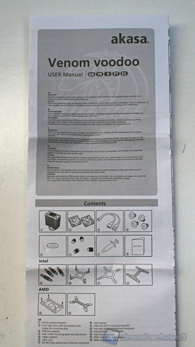 Nota preliminare : Durante l’installazione del Venom Voodoo fate attenzione a non fare troppa pressione sul socket della scheda madre. Il sistema di ritenzione progettato da Akasa è infatti molto forte e tende a curvare il PCB nel caso in cui stringete le viti con troppa forza. Questa piccola accortezza sarà sufficiente per evitare potenziali problemi.