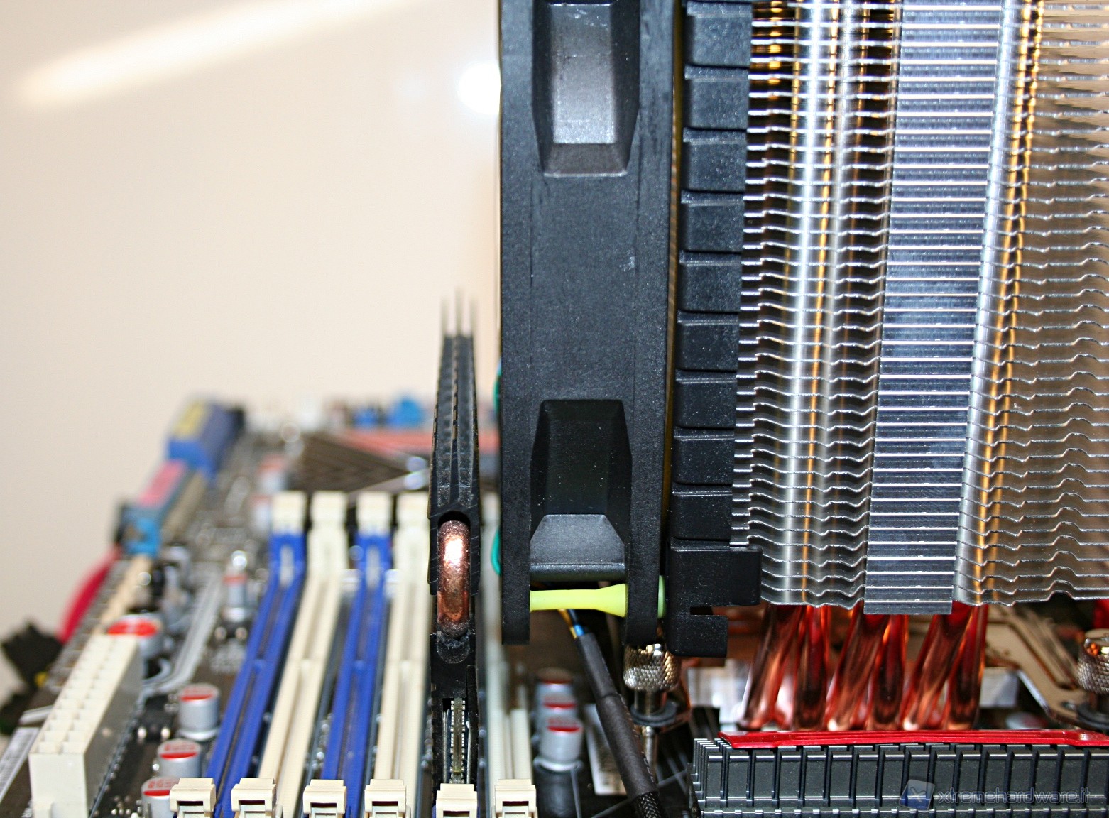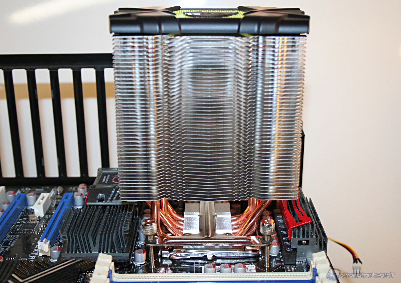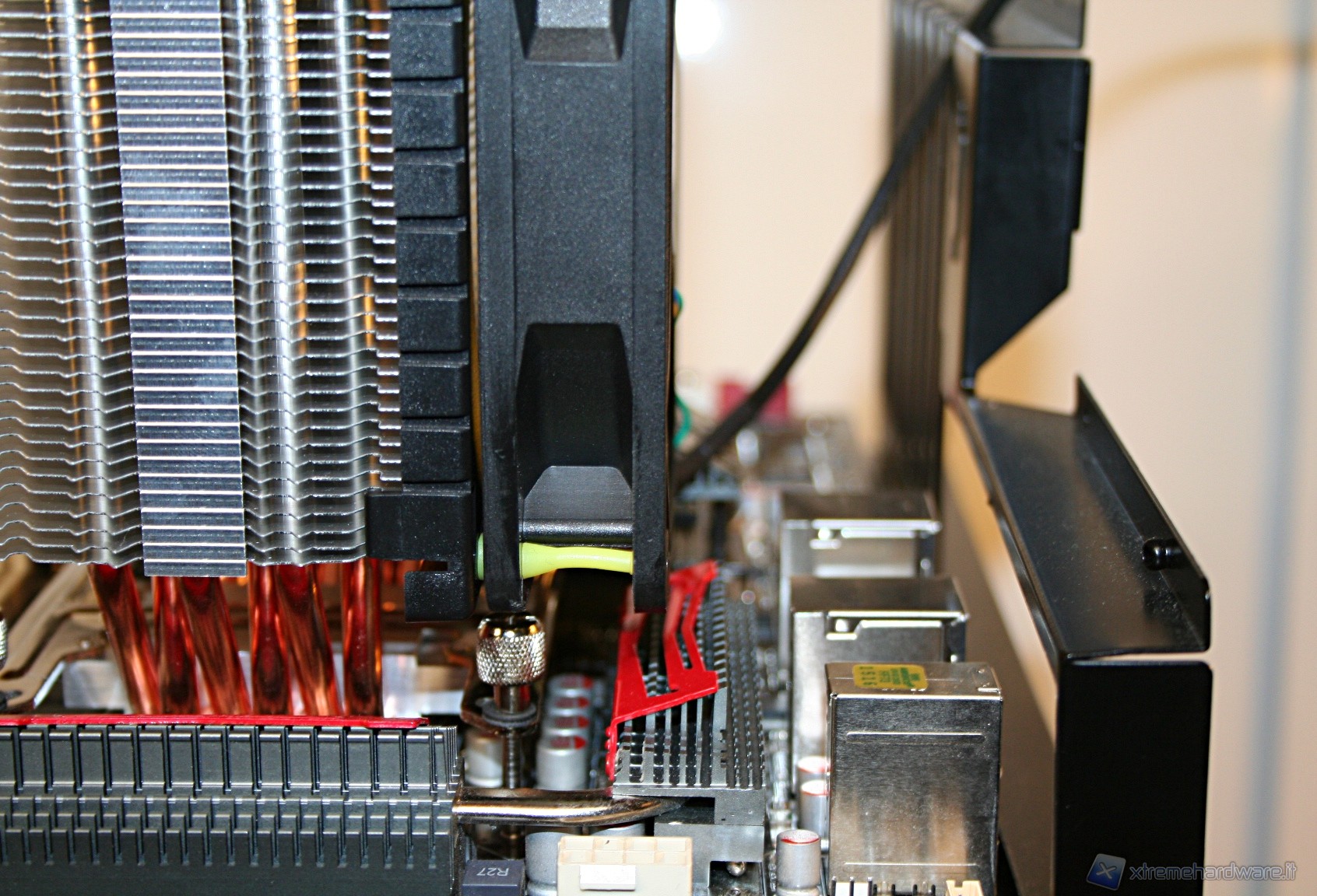 Il montaggio è facile ed è tutto molto stabile, una volta completata l’operazione. Unica nota negativa, sebbene le dimensioni complessive risultino contenute, è che montando la ventola da 120mm in configurazione Push, ovvero come viene fornita di fabbrica, si va ad ostruire il primo banco di RAM, se queste ultime sono ad elevato profilo. E’ eventualmente possibile installare la sola ventola in configurazione pull, permettendo così di popolare tutti i sei slot di RAM disponibili. Facciamo notare inoltre che il montaggio è stato effettuato su una ASUS X58 P6T Deluxe V2: in altre schede madri in cui la distanza degli slot dal socket è inferiore, la ventola potrebbe interferire con altri slot addizionali anziché solo il primo. Abbiamo posizionato il dissipatore con la ventola in immissione rivolta verso i banchi di RAM. Questa è la configurazione migliore in un cabinet poiché si crea un flusso che tende a spingere l’aria calda verso l’esterno, omogeneo con quello creato dalle altre ventole presenti nel case.