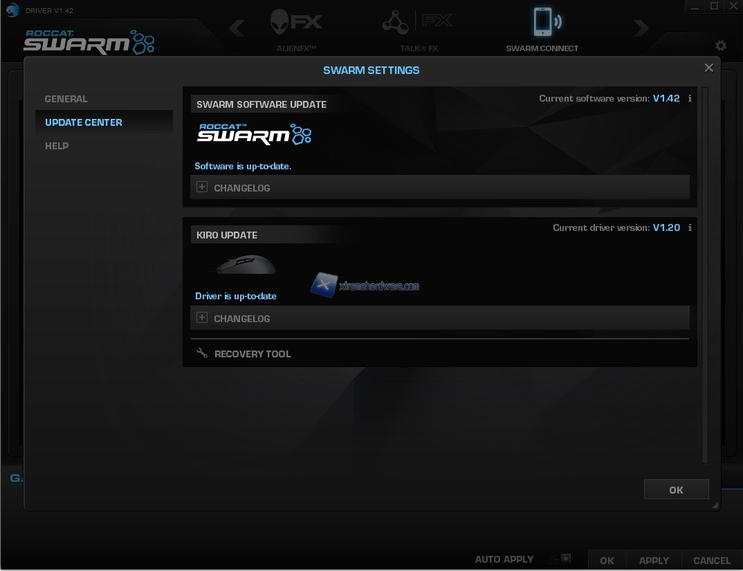 Il software di gestione ROCCAT Swarm si conclude con un Menù per la gestione e controllo dei dispositivi connessi e compatibili e la relativa disponibilità di aggiornamenti. Potremo controllare anche tutti gli eventuali Change-Log per i nuovi aggiornamenti. Viene messo a disposizione anche un Recovery Tool in caso di problemi dovuti ad un nuovo aggiornamento o malfunzionamento della periferica. Potremo inoltre cambiare lingua di visualizzazione.