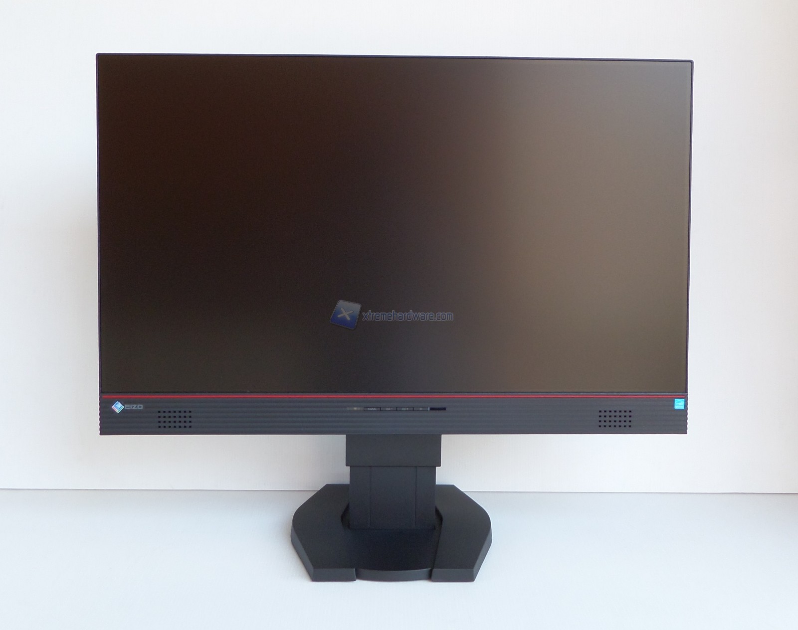 Ogni volta che si ha davanti un monitor EIZO si ha sempre la solita impressione di solidità e l’FS2434 non è da meno. Partendo dal display, si ha a che fare un rivestimento anti-glare classico, tipico degli IPS, quindi non una versione semi-glossy simile ai modelli VA. La barra in basso è piuttosto ampia, misurando circa 4 cm, ma oltre ai controller centrali, qui trovano posto due speaker audio ai lati. Nonostante la barra rossa, che era presente anche in altri modelli della serie FS (e in diversi colori), il tema della trama rimane differente e non presenta inclinature come nei precedenti FORIS FS. La parte però su cui ha puntato EIZO sono le altre cornici. Metro alla mano, misuriamo proprio 6 mm per i lati laterali e quello superiore, rendendo così il monitor davvero adatto a soluzioni multi-display.
